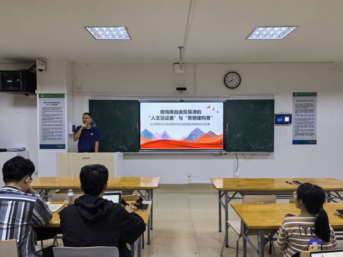 为加深2025级研究生对海南自贸港建设政策的理解,强化使命担当,坚定理想信念,10月14日晚,文学院2025级研究生在桂林洋校区文学楼305教室开展了自贸港政策解读与理想信念教育活动。本次教育活动由副处级辅导员陈俊峰和研究生辅导员周政共同主讲。