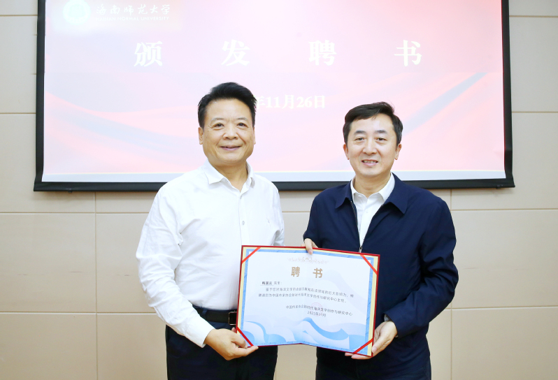 聂清斌校长为中心主任、副主任颁发了聘书。著名作家、海南省文联一级巡视员、原海南省作家协会主席梅国云任中心主任。担任中心副主任的分别是:海南师范大学文学院院长、二级教授王学振;海南省作家协会副主席、海南省文学院院长江非;省出版发行集团副总经理、南方出版社总编辑古莉;海南大学教授、韩少功创意写作中心主任李音;海南省作家协会副主席、《天涯》主编林森。
