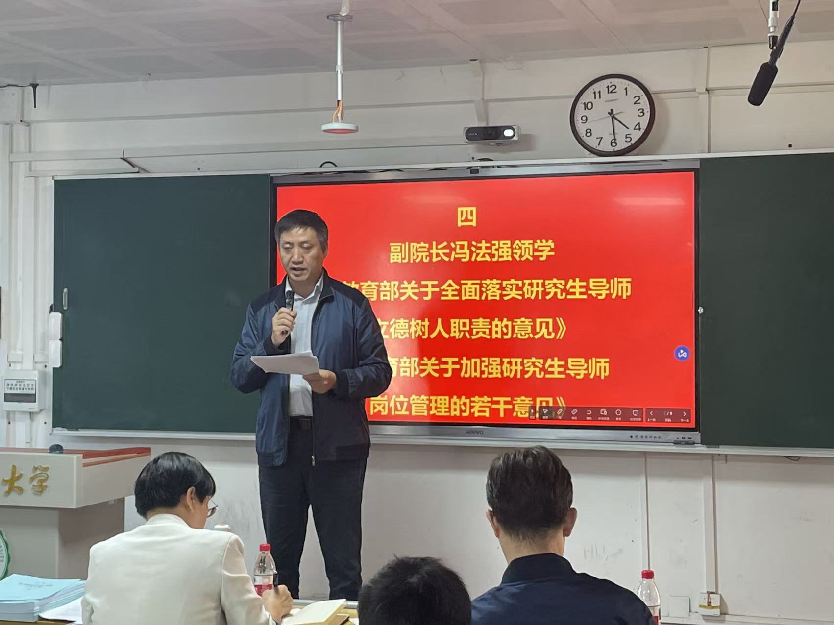 随后,副院长冯法强,纪委书记、副处级辅导员陈俊峰分别带大家领学了《教育部关于全面落实研究生导师立德树人职责的意见》、《教育部关于进一步加强和改进研究生思想政治教育的若干意见》等四个文件,旨在明确研究生导师在思想引领、学术指导、师生关系等方面的要求,将立德树人与专业培养深度融合,兼顾学术能力提升与思想道德修养培育,适配新时代研究生教育发展要求。